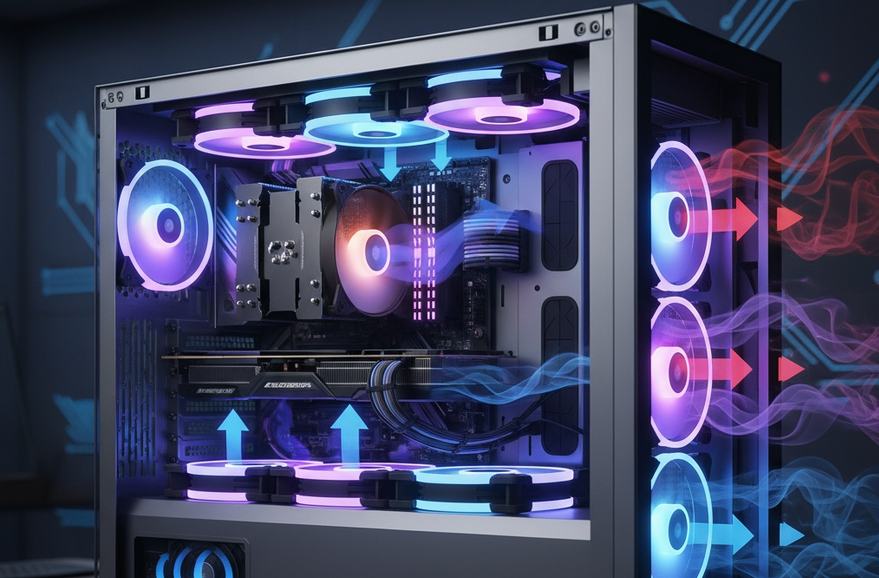 A megfelelő légáramlás kritikus a hatékony hűtéshez. Az ideális konfiguráció: pozitív nyomás – több levegő áramlik be, mint ki. Ez csökkenti a por felhalmozódását.