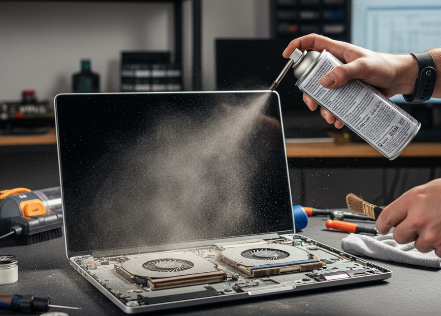 Használjunk sűrített levegős spray-t a por kifújásához. Tartsuk a spray-t 10-15 cm távolságra. Rögzítsük a ventilátor lapátjait, hogy ne pörögjenek – a gyors forgás károsíthatja a motort.