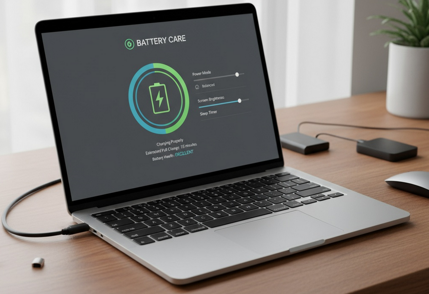 Ne tartsuk a laptopot folyamatosan töltőn. Ha otthon használjuk, időnként merüljön le 40-50%-ra, majd töltsük vissza. Ez egészségesebb az akkumulátornak.